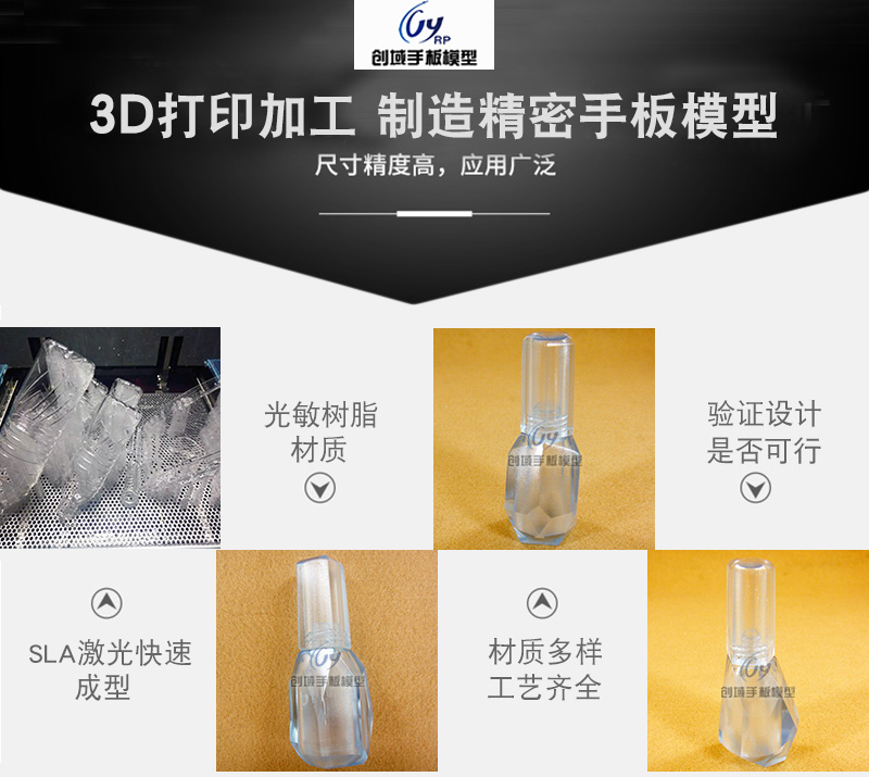 指甲油瓶手板主要由SLA激光快速成型制作完成,材質(zhì):光敏樹脂料。制作出來的樣品再經(jīng)過后處理專業(yè)技術(shù)人員的細(xì)心打磨、拋光、噴油表面工藝處理,是您創(chuàng)作的體現(xiàn),制作過程需要3個(gè)工作天。屆時(shí)我司將與快遞的方式送達(dá)客戶手中。